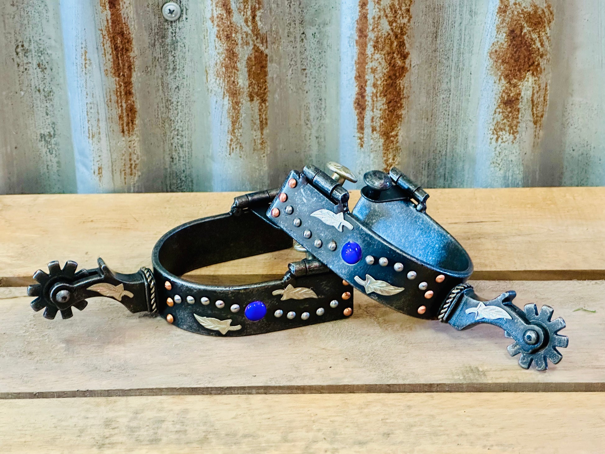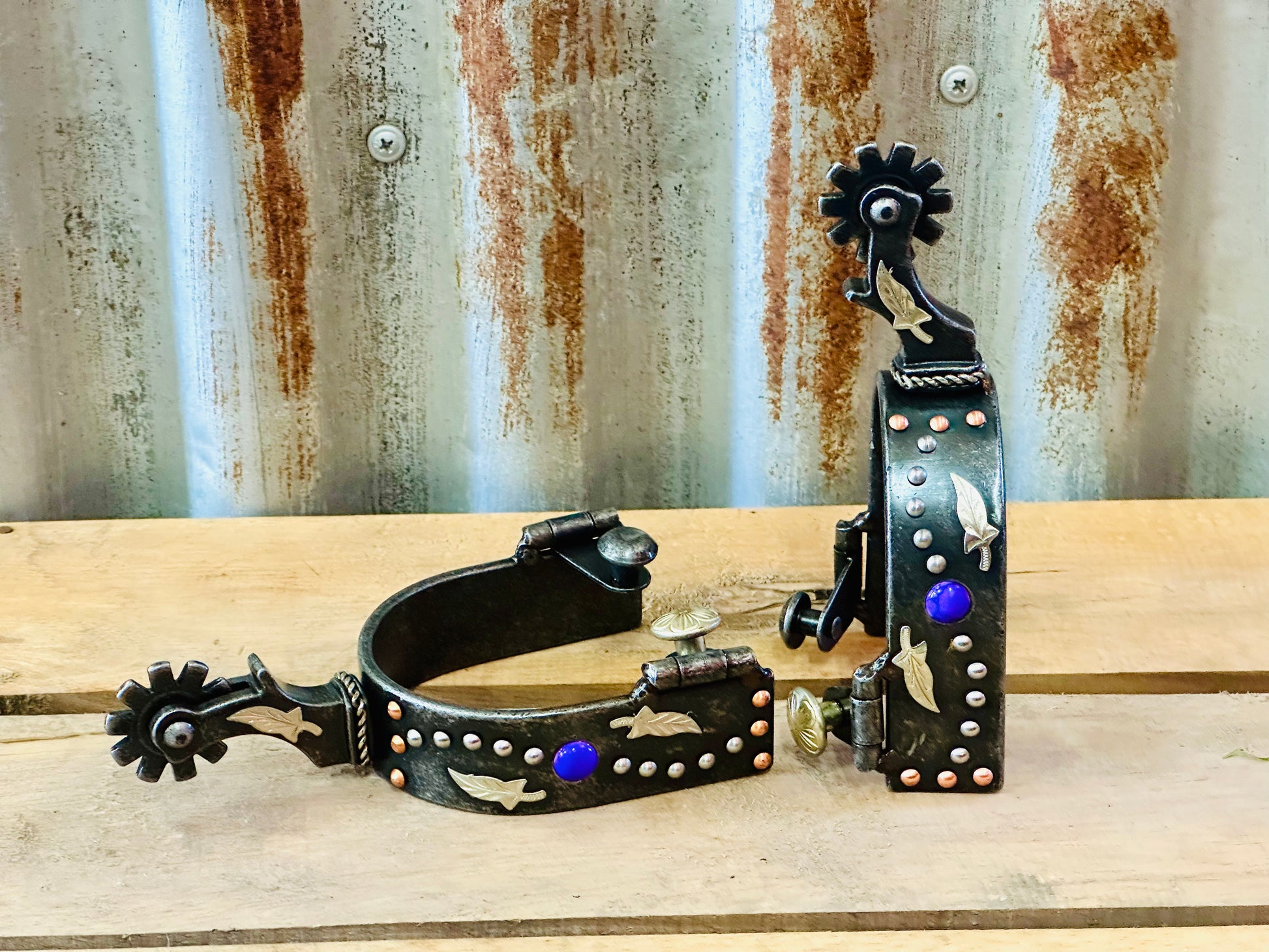 Antique gray steel spur with purple marble studs and silver and copper studs. This spur features 3" boot opening with a 1" band and a 2" shank.