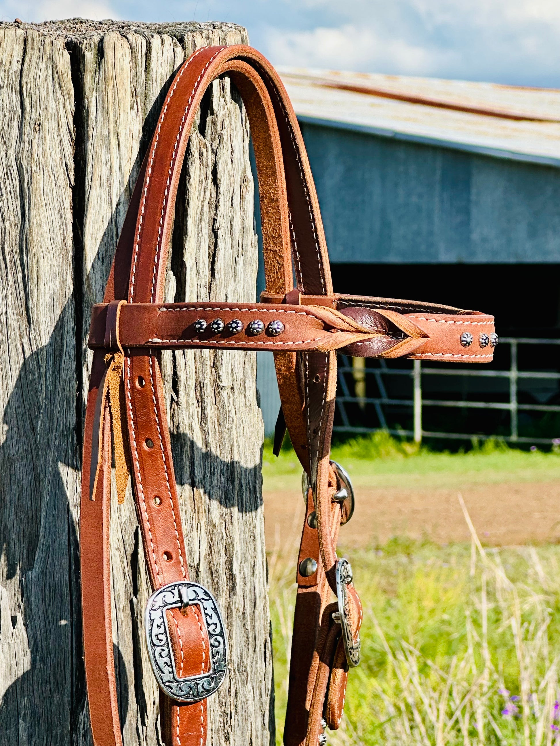 Crafted from premium harness leather, this handmade browband bridle features a classic bloodknot design, durable stitched sides, and eye-catching sunspot studs. Built for both style and strength, it’s the perfect choice for riders who value quality, comfort, and timeless western craftsmanship.