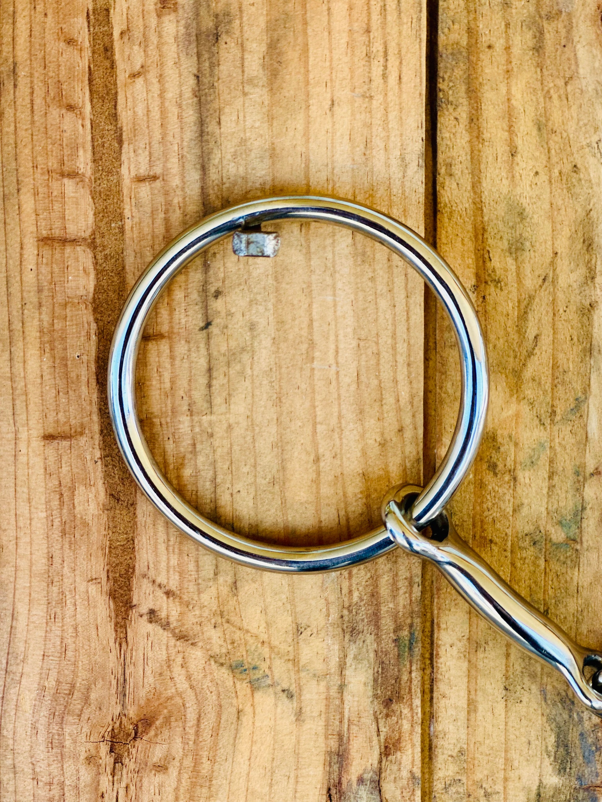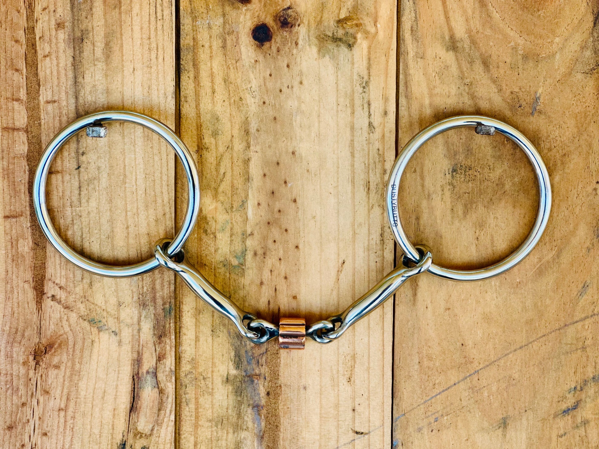 The three piece loose ring smooth snaffle bit with cricket affects the horse by applying pressure on the tongue, bars and the corners of the mouth. The dogbone/ copper cricket mouthpiece encourages salivation and keeps the mouth soft. It is designed for all disciplines and any level of horse.