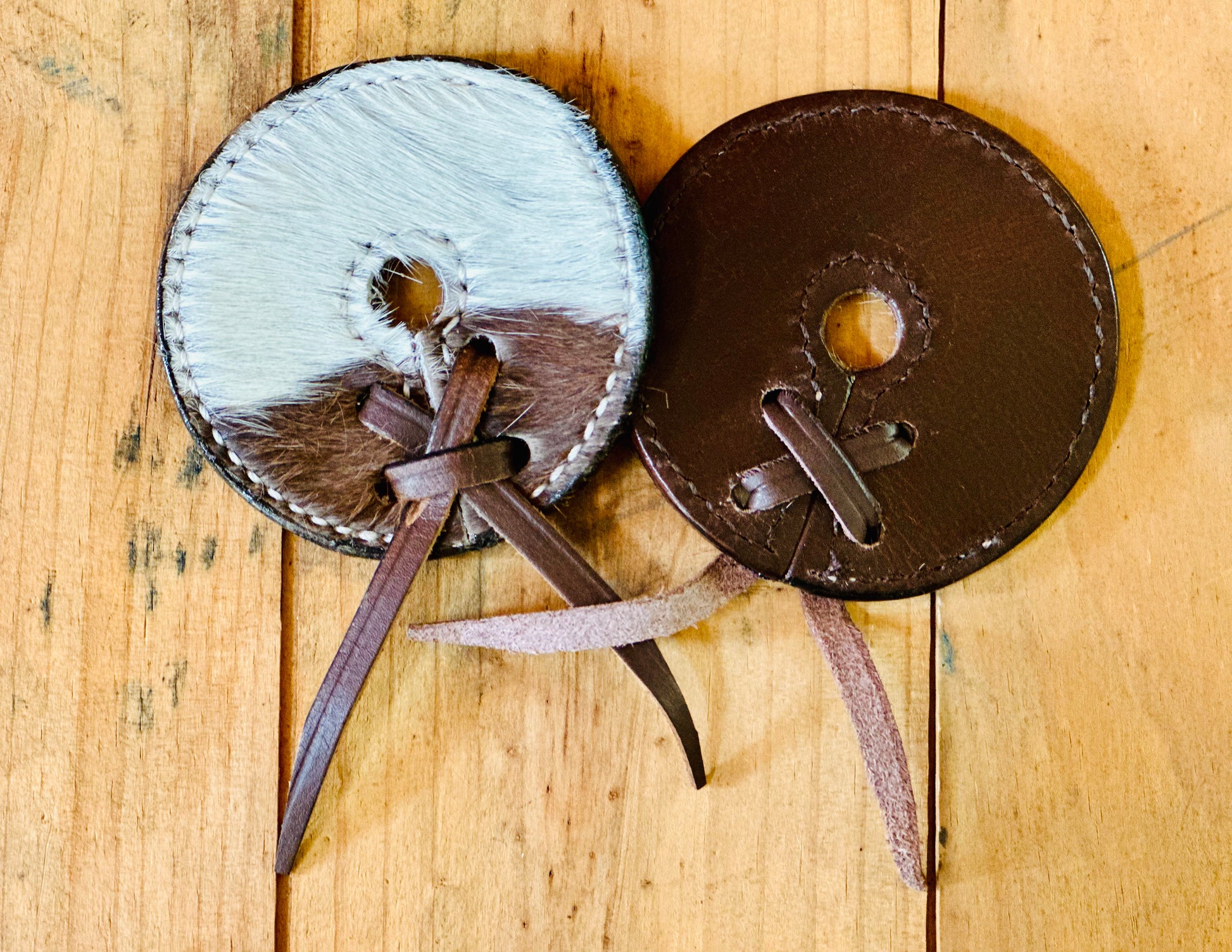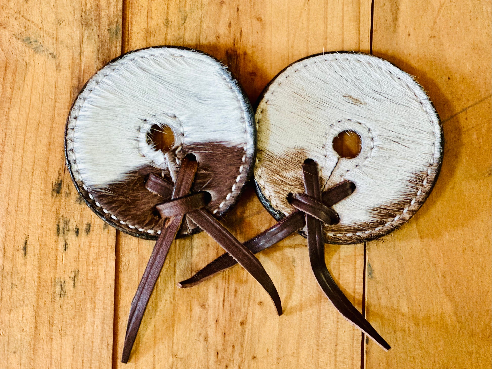 Hair on Cowhide Leather bit guards. Measures 3" wide with leather strap closure. Durable, soft and flexible to keep the horse comfortable and prevent the bit from rubbing.