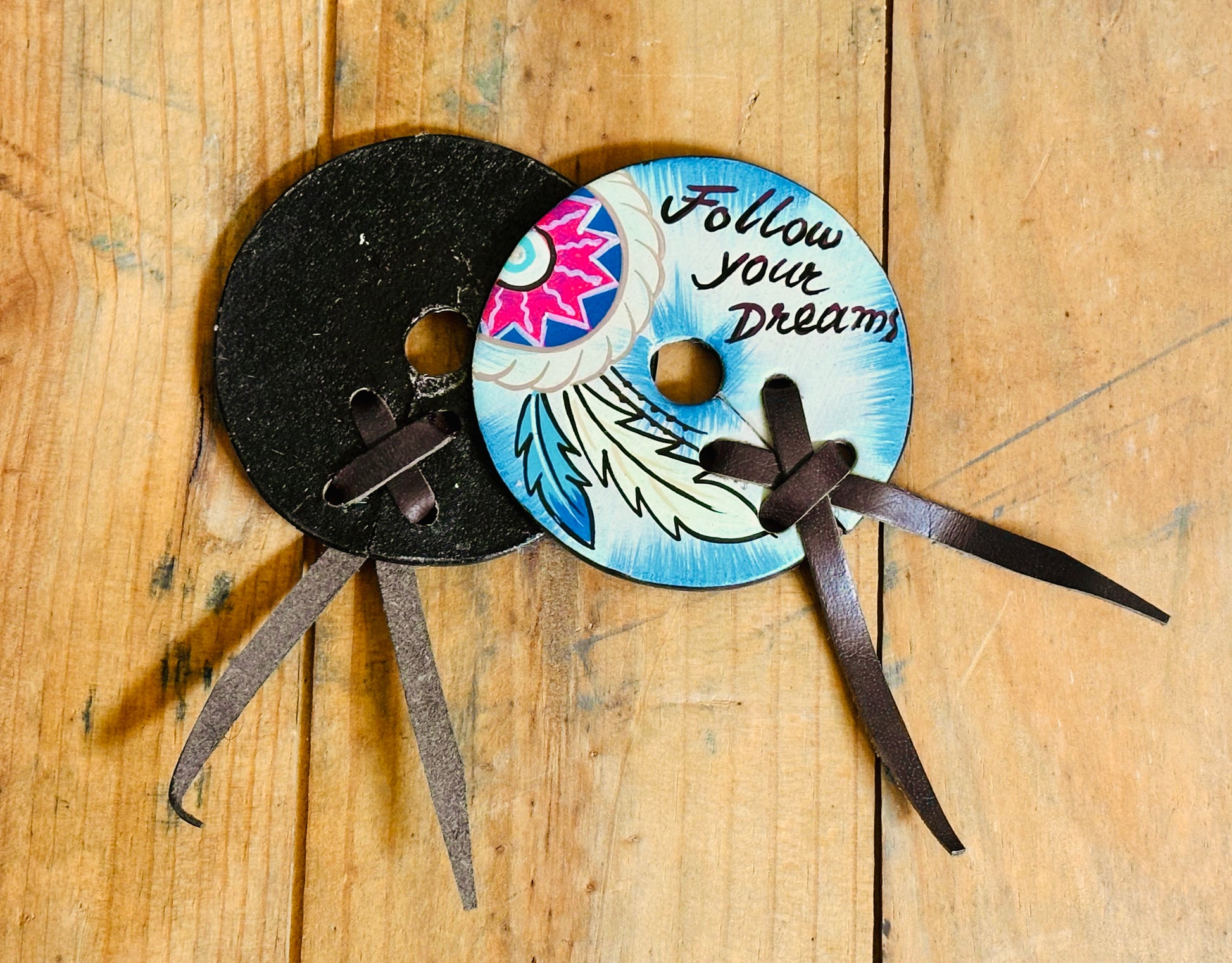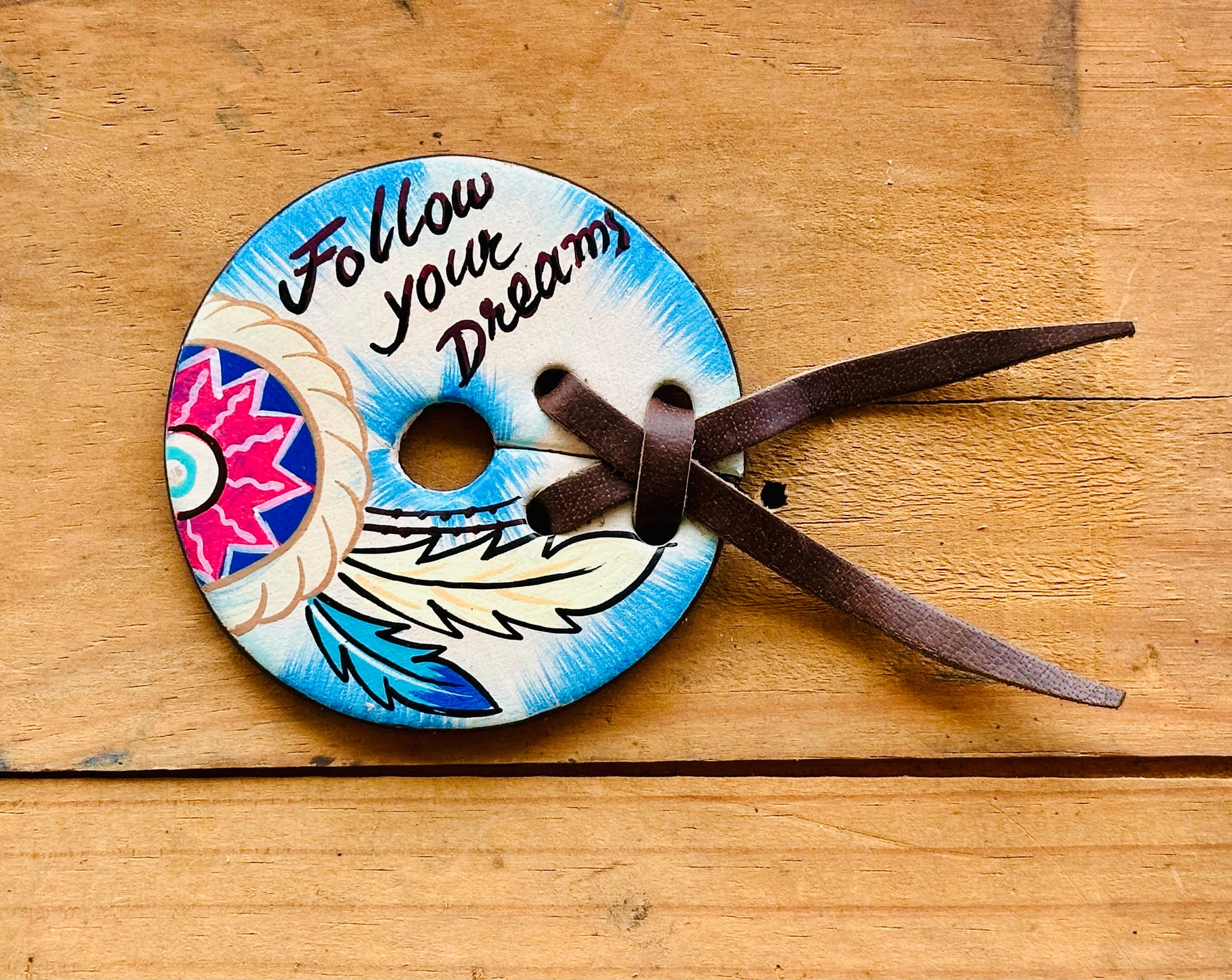 " Follow Your Dreams" bit guards with dream catcher design. 3" wide hand painted leather with leather strap closure. Durable, soft and flexible to keep the horse comfortable and prevent the bit from rubbing.