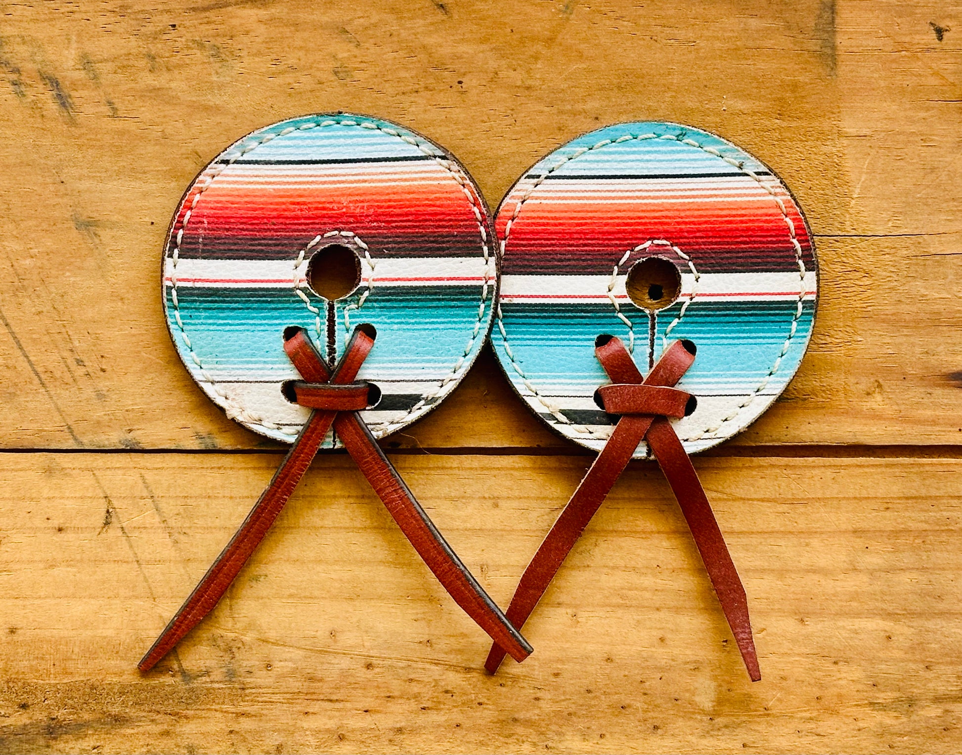 Leather bit guards with southwest serape printed design. Measures 3" wide with leather strap closure. Durable, soft and flexible to keep the horse comfortable and prevent the bit from rubbing.